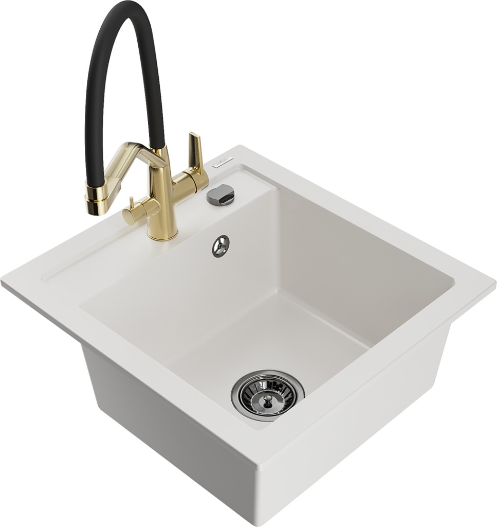 Technické dáta: drez: Rozmer: 520 x 490 x 210 mm Hĺbka komory: 200 mm Rozmery komory: 410x360 mm Priemer odtoku: ø90 mm Typ: 1-komorový Typ: Zapustené do pracovnej dosky biela farba Povrchová úprava sifónu: čierna Materiál: žula (80% žulové kamenivo, 20% živice) Prepadový otvor: Áno Otvory: (batérie, automatické) 2 Vysoká odolnosť proti poškriabaniu a zmene farby Odolnosť proti tepelným šokom Ľahko čistiteľný povrch Jeden dodatočný vyfrézovaný otvor na samodierovanie ø35 kuchynská batéria: Materiál: mosadz Povrchová úprava: zlatá/čierna Hlavy: Keramické Prevzdušňovač: Áno Typ hubica: Flexibilný s mosadzným držiakom Rozsah výtoku: 260 mm Výška: 405 mm Typ: Dve rukoväte Dvojhlavá batéria s prídavným filtrom na pitnú vodu(GT) Ean: 5905315043238