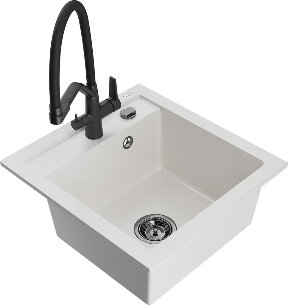Technické dáta: drez: Rozmer: 520 x 490 x 210 mm Hĺbka komory: 200 mm Rozmery komory: 410x360 mm Priemer odtoku: ø90 mm Typ: 1-komorový Typ: Zapustené do pracovnej dosky biela farba Povrchová úprava sifónu: čierna Materiál: žula (80% žulové kamenivo, 20% živice) Prepadový otvor: Áno Otvory: (batérie, automatické) 2 Vysoká odolnosť proti poškriabaniu a zmene farby Odolnosť proti tepelným šokom Ľahko čistiteľný povrch Jeden dodatočný vyfrézovaný otvor na samodierovanie ø35 kuchynská batéria: Materiál: mosadz Povrchová úprava: čierna Hlavy: Keramické Prevzdušňovač: Áno Typ hubica: Flexibilný s mosadzným držiakom Rozsah výtoku: 260 mm Výška: 405 mm Typ: Dve rukoväte Dvojhlavá batéria s prídavným filtrom na pitnú vodu (GT) Ean: 5905315043290