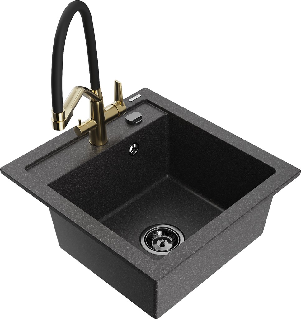 Technické dáta: drez: Rozmer: 520 x 490 x 210 mm Hĺbka komory: 200 mm Rozmery komory: 410x360 mm Priemer odtoku: ø90 mm Typ: 1-komorový Typ: Zapustené do pracovnej dosky Farba: Škvrnitá čierna Povrchová úprava sifónu: čierna Materiál: žula (80% žulové kamenivo, 20% živice) Prepadový otvor: Áno Otvory: (batérie, automatické) 2 Vysoká odolnosť proti poškriabaniu a zmene farby Odolnosť proti tepelným šokom Ľahko čistiteľný povrch Jeden dodatočný vyfrézovaný otvor na samodierovanie ø35 kuchynská batéria: Materiál: mosadz Povrchová úprava: zlatá/čierna Hlavy: Keramické Prevzdušňovač: Áno Typ hubica: Flexibilný s mosadzným držiakom Rozsah výtoku: 260 mm Výška: 405 mm Typ: Dve rukoväte Dvojhlavá batéria s prídavným filtrom na pitnú vodu(GT) Ean: 5905315044976
