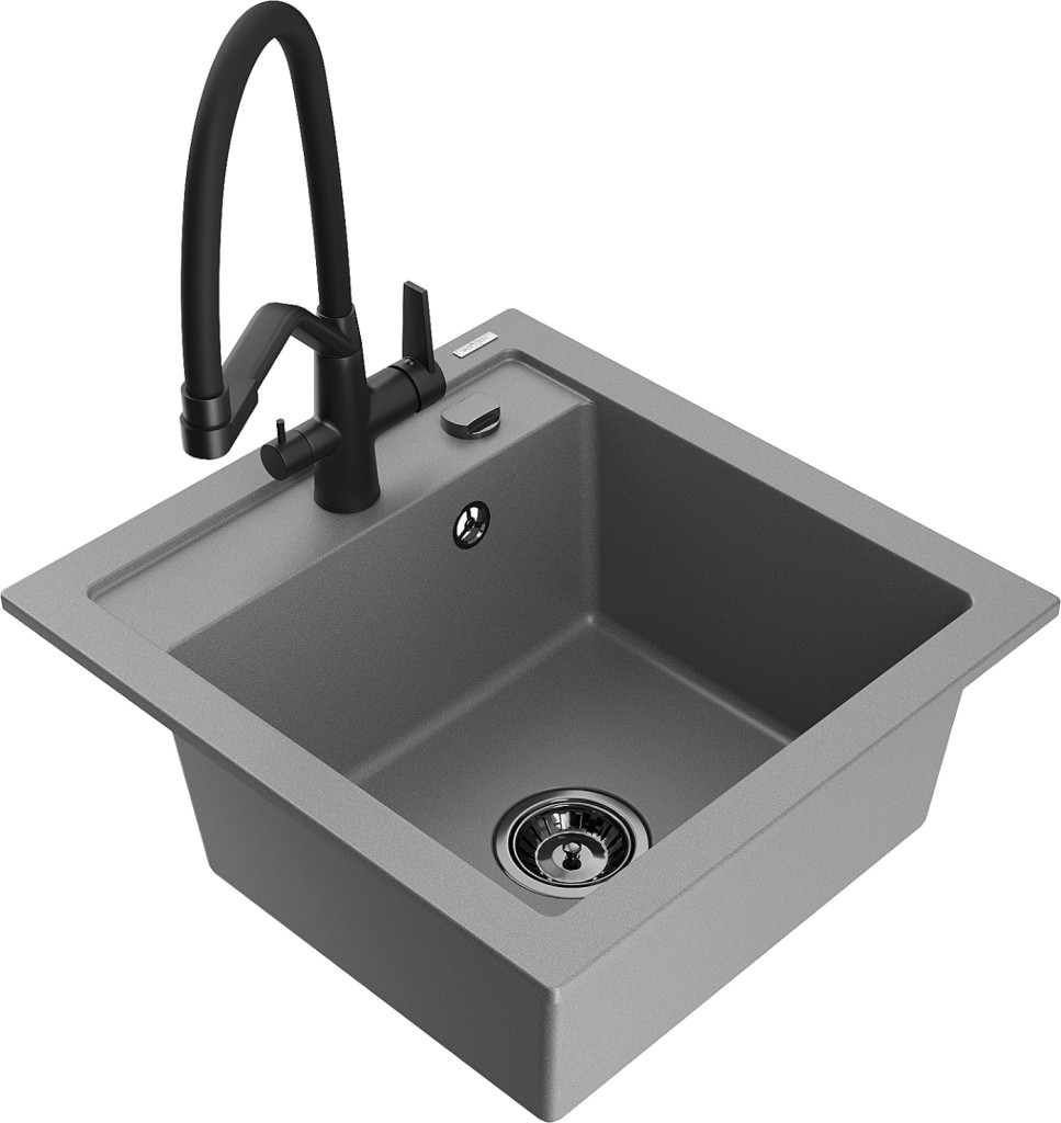 Technické dáta: Drez: Rozmer: 520x490x210 mm Hĺbka komory: 200 mm Rozmery komory: 410x360 mm Priemer odtoku: ø90 mm Typ: 1-komorový Typ: Zapustené do pracovnej dosky Šedá farba Povrchová úprava sifónu: čierna Materiál: žula (80% žulové kamenivo 20% živice) Prepadový otvor: Áno Otvory: (batérie, automat) 2 Vysoká odolnosť proti poškriabaniu a zmene farby Odolnosť proti tepelným šokom Povrch pre ľahké čistenie Jeden dodatočný vyfrézovaný otvor na samodierovanie ø35 Kuchynská batéria: Materiál: mosadz Povrchová úprava: čierna Hlavy: Keramické Perlátor: Áno Typ výtoku: Flexibilný s mosadzným držiakom Rozsah výtoku: 260 mm Výška: 405 mm Typ: Dve rukoväte Dvojhlavá batéria s prídavným filtrom na pitnú vodu(GT) Ean: 5905315044013