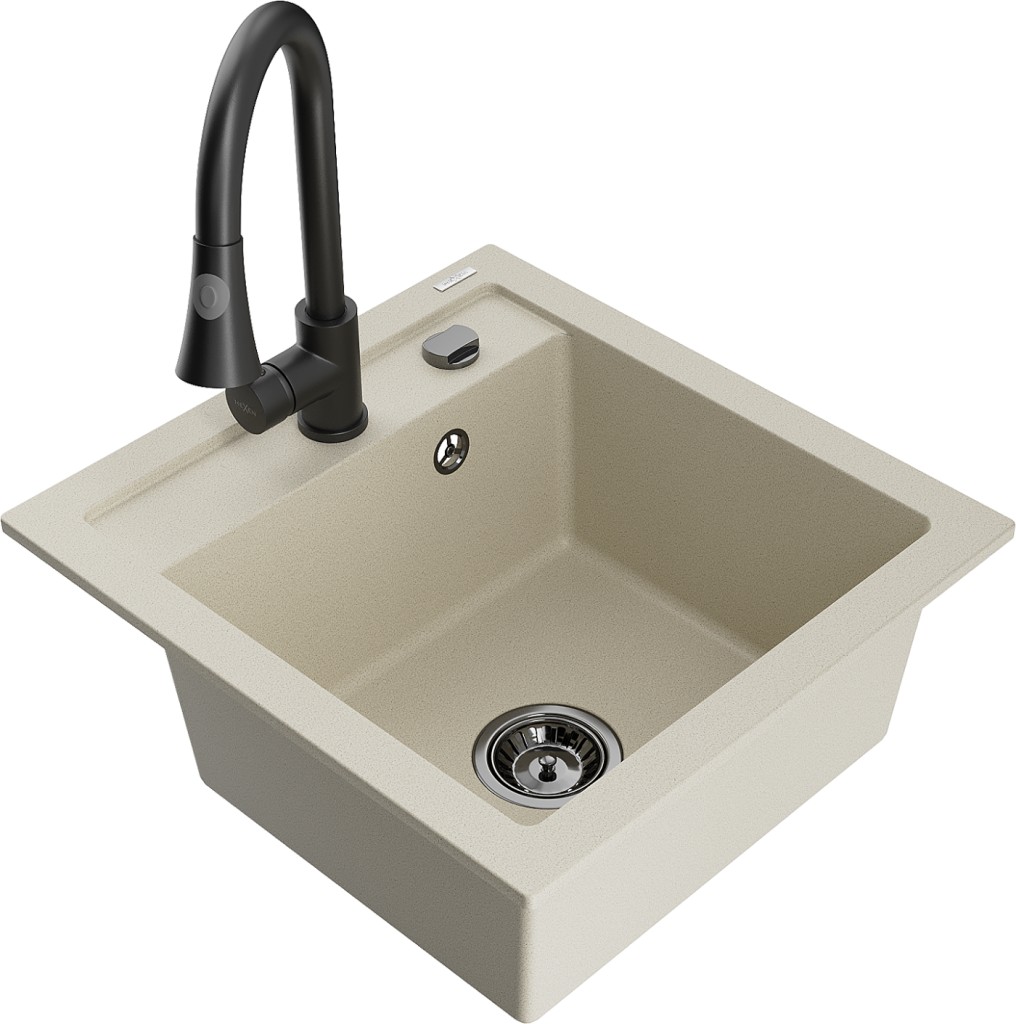 Technické dáta: drez: Rozmer: 520 x 490 x 210 mm Hĺbka komory: 200 mm Rozmery komory: 410x360 mm Priemer odtoku: ø90 mm Typ: 1-komorový Typ: Zapustené do pracovnej dosky Farba béžová Povrchová úprava sifónu: čierna Materiál: žula (80% žulové kamenivo, 20% živice) Prepadový otvor: Áno Otvory: (batérie, automatické) 2 Vysoká odolnosť proti poškriabaniu a zmene farby Odolnosť proti tepelným šokom Ľahko čistiteľný povrch Jeden dodatočný vyfrézovaný otvor na samodierovanie ø35 kuchynská batéria: Materiál: mosadz Čierna farba Hlava: Keramická Prevzdušňovač: Áno Typ: Jedna páka Výška batérie: 380 mm Rozsah výtoku: 252 mm Typ výtoku: Výsuvný(GT) Ean: 5905315027832