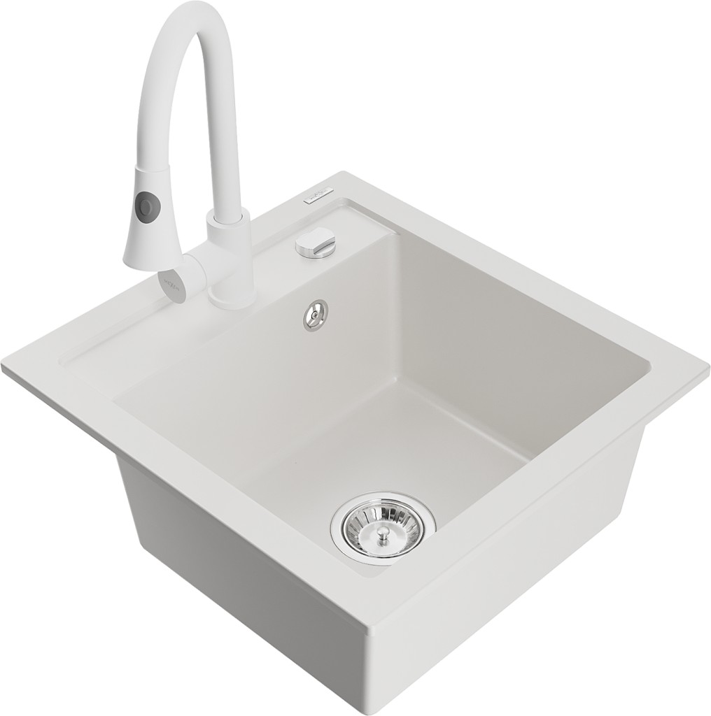 Technické dáta: drez: Rozmer: 520 x 490 x 210 mm Hĺbka komory: 200 mm Rozmery komory: 410x360 mm Priemer odtoku: ø90 mm Typ: 1-komorový Typ: Zapustené do pracovnej dosky biela farba Povrchová úprava sifónu: Chrome Materiál: žula (80% žulové kamenivo, 20% živice) Prepadový otvor: Áno Otvory: (batérie, automatické) 2 Vysoká odolnosť proti poškriabaniu a zmene farby Odolnosť proti tepelným šokom Ľahko čistiteľný povrch Jeden dodatočný vyfrézovaný otvor na samodierovanie ø35 kuchynská batéria: Materiál: mosadz biela farba Hlava: Keramická Prevzdušňovač: Áno Typ: Jedna páka Výška batérie: 380 mm Rozsah výtoku: 252 mm Typ výtoku: Výsuvný(GT) Ean: 5905315027771