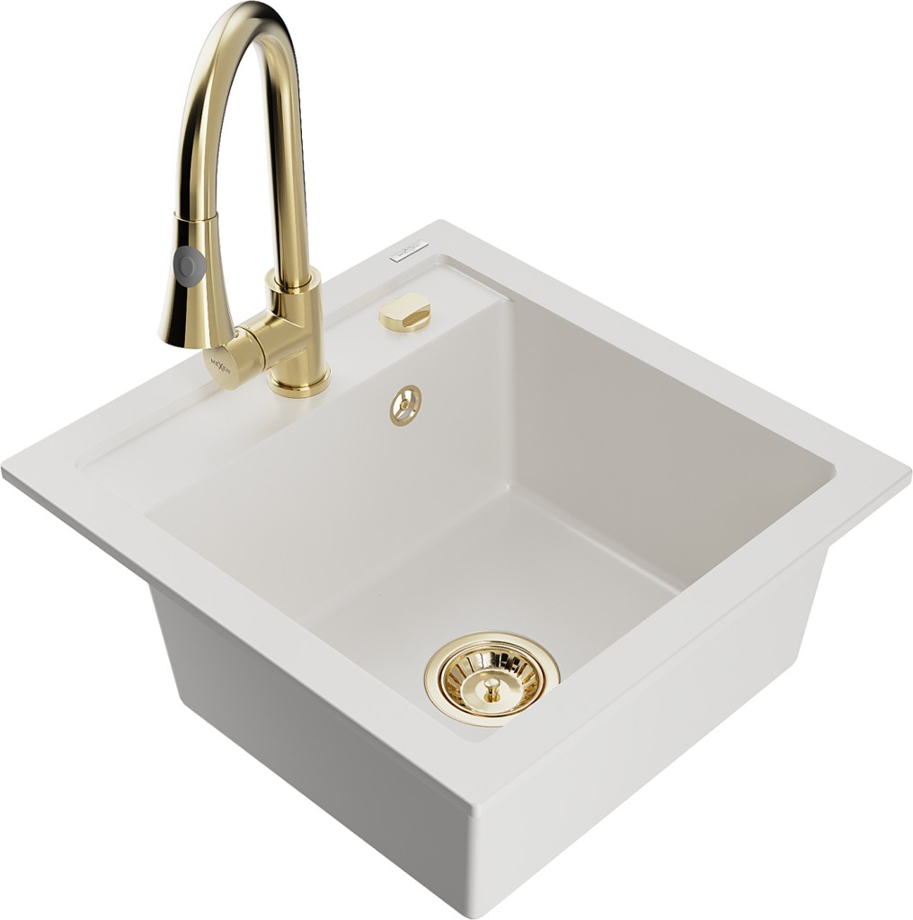 Technické dáta: drez: Rozmer: 520 x 490 x 210 mm Hĺbka komory: 200 mm Rozmery komory: 410x360 mm Priemer odtoku: ø90 mm Typ: 1-komorový Typ: Zapustené do pracovnej dosky biela farba Povrchová úprava sifónu: zlatá Materiál: žula (80% žulové kamenivo, 20% živice) Prepadový otvor: Áno Otvory: (batérie, automatické) 2 Vysoká odolnosť proti poškriabaniu a zmene farby Odolnosť proti tepelným šokom Ľahko čistiteľný povrch Jeden dodatočný vyfrézovaný otvor na samodierovanie ø35 kuchynská batéria: Materiál: mosadz Farba: Zlatá Hlava: Keramická Prevzdušňovač: Áno Typ: Jedna páka Výška batérie: 380 mm Rozsah výtoku: 252 mm Typ výtoku: Výsuvný(GT) Ean: 5905315027788