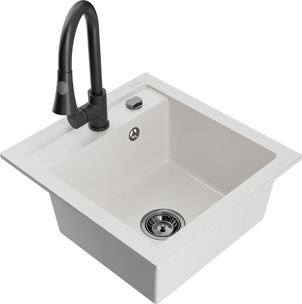 Technické dáta: drez: Rozmer: 520 x 490 x 210 mm Hĺbka komory: 200 mm Rozmery komory: 410x360 mm Priemer odtoku: ø90 mm Typ: 1-komorový Typ: Zapustené do pracovnej dosky biela farba Povrchová úprava sifónu: čierna Materiál: žula (80% žulové kamenivo, 20% živice) Prepadový otvor: Áno Otvory: (batérie, automatické) 2 Vysoká odolnosť proti poškriabaniu a zmene farby Odolnosť proti tepelným šokom Ľahko čistiteľný povrch Jeden dodatočný vyfrézovaný otvor na samodierovanie ø35 kuchynská batéria: Materiál: mosadz Čierna farba Hlava: Keramická Prevzdušňovač: Áno Typ: Jedna páka Výška batérie: 380 mm Rozsah výtoku: 252 mm Typ výtoku: Výsuvný(GT) Ean: 5905315027795