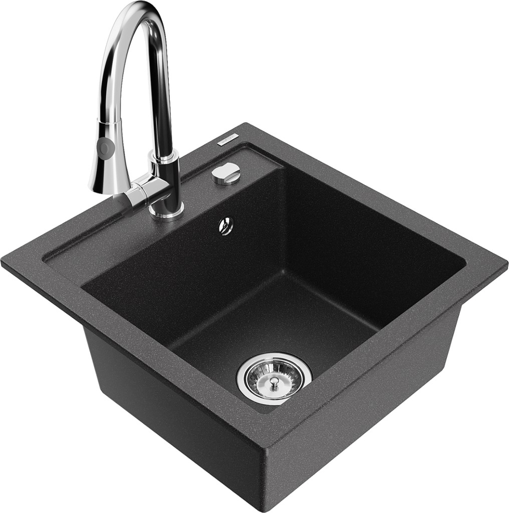 Technické dáta: drez: Rozmer: 520 x 490 x 210 mm Hĺbka komory: 200 mm Rozmery komory: 410x360 mm Priemer odtoku: ø90 mm Typ: 1-komorový Typ: Zapustené do pracovnej dosky Farba: Škvrnitá čierna Povrchová úprava sifónu: Chrome Materiál: žula (80% žulové kamenivo, 20% živice) Prepadový otvor: Áno Otvory: (batérie, automatické) 2 Vysoká odolnosť proti poškriabaniu a zmene farby Odolnosť proti tepelným šokom Ľahko čistiteľný povrch Jeden dodatočný vyfrézovaný otvor na samodierovanie ø35 kuchynská batéria: Materiál: mosadz Farba: Chrome Hlava: Keramická Prevzdušňovač: Áno Typ: Jedna páka Výška batérie: 380 mm Rozsah výtoku: 252 mm Typ výtoku: Výsuvný(GT) Ean: 5905315027986