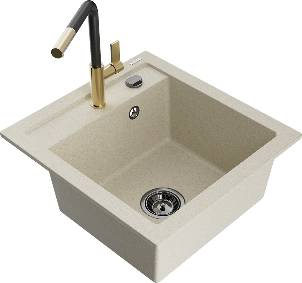 Technické dáta: drez: Rozmer: 520 x 490 x 210 mm Hĺbka komory: 200 mm Rozmery komory: 410x360 mm Priemer odtoku: ø90 mm Typ: 1-komorový Typ: Zapustené do pracovnej dosky Farba béžová Povrchová úprava sifónu: čierna Materiál: žula (80% žulové kamenivo, 20% živice) Prepadový otvor: Áno Otvory: (batérie, automatické) 2 Vysoká odolnosť proti poškriabaniu a zmene farby Odolnosť proti tepelným šokom Ľahko čistiteľný povrch Jeden dodatočný vyfrézovaný otvor na samodierovanie ø35 kuchynská batéria: Materiál: mosadz Farba: Zlatá/Čierna Hlava: Keramická Prevzdušňovač: Áno Typ: Jedna páka Rozsah výtoku: 245 mm Výška batérie: 307 mm(GT) Ean: 5905315057082