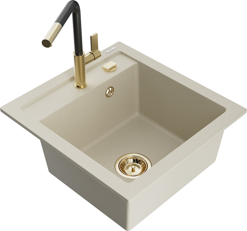 Technické dáta: drez: Rozmer: 520 x 490 x 210 mm Hĺbka komory: 200 mm Rozmery komory: 410x360 mm Priemer odtoku: ø90 mm Typ: 1-komorový Typ: Zapustené do pracovnej dosky Farba béžová Povrchová úprava sifónu: zlatá Materiál: žula (80% žulové kamenivo, 20% živice) Prepadový otvor: Áno Otvory: (batérie, automatické) 2 Vysoká odolnosť proti poškriabaniu a zmene farby Odolnosť proti tepelným šokom Ľahko čistiteľný povrch Jeden dodatočný vyfrézovaný otvor na samodierovanie ø35 kuchynská batéria: Materiál: mosadz Farba: Zlatá/Čierna Hlava: Keramická Prevzdušňovač: Áno Typ: Jedna páka Rozsah výtoku: 245 mm Výška batérie: 307 mm(GT) Ean: 5905315057075