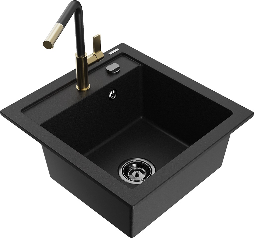 Technické dáta: drez: Rozmer: 520 x 490 x 210 mm Hĺbka komory: 200 mm Rozmery komory: 410x360 mm Priemer odtoku: ø90 mm Typ: 1-komorový Typ: Zapustené do pracovnej dosky Čierna farba Povrchová úprava sifónu: čierna Materiál: žula (80% žulové kamenivo, 20% živice) Prepadový otvor: Áno Otvory: (batérie, automatické) 2 Vysoká odolnosť proti poškriabaniu a zmene farby Odolnosť proti tepelným šokom Ľahko čistiteľný povrch Jeden dodatočný vyfrézovaný otvor na samodierovanie ø35 kuchynská batéria: Materiál: mosadz Farba: Zlatá/Čierna Hlava: Keramická Prevzdušňovač: Áno Typ: Jedna páka Rozsah výtoku: 245 mm Výška batérie: 307 mm(GT) Ean: 5905315057433