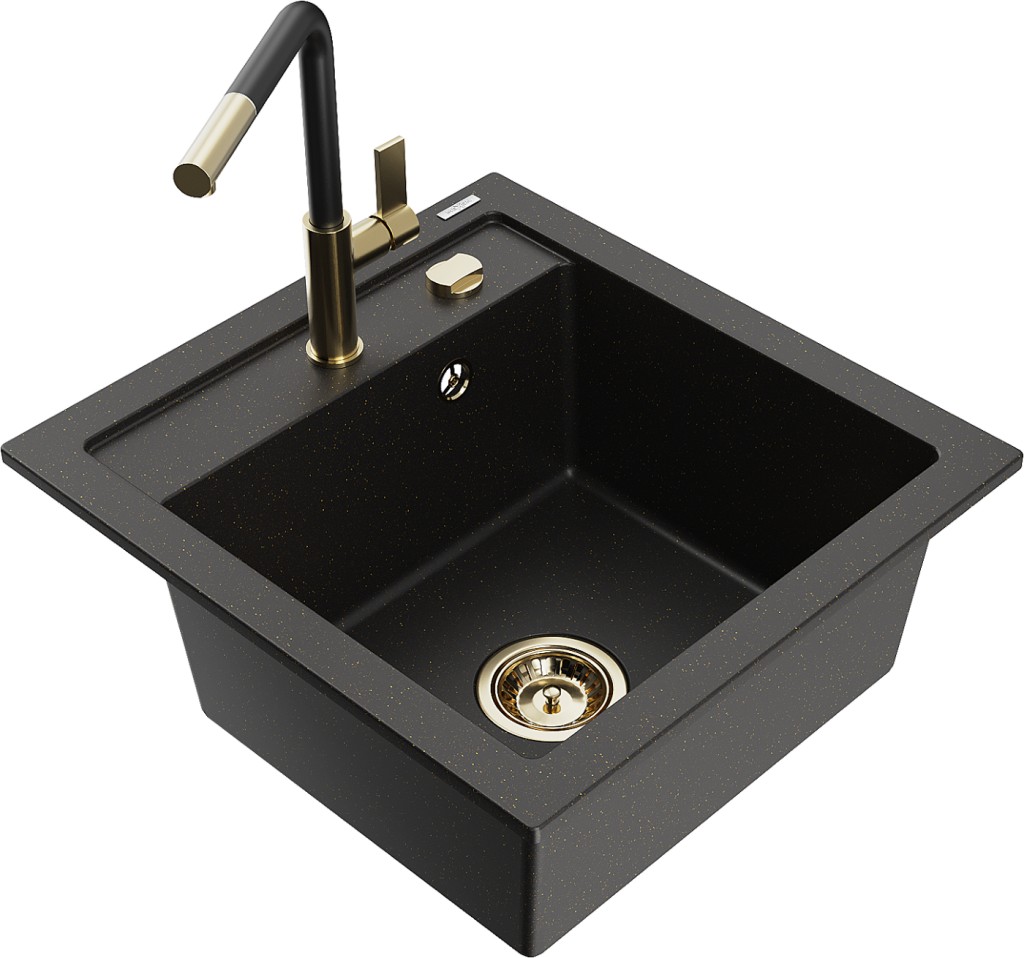 Technické dáta: drez: Rozmer: 520 x 490 x 210 mm Hĺbka komory: 200 mm Rozmery komory: 410x360 mm Priemer odtoku: ø90 mm Typ: 1-komorový Typ: Zapustené do pracovnej dosky Farba: čierna / zlatá metalíza Povrchová úprava sifónu: zlatá Materiál: žula (80% žulové kamenivo, 20% živice) Prepadový otvor: Áno Otvory: (batérie, automatické) 2 Vysoká odolnosť proti poškriabaniu a zmene farby Odolnosť proti tepelným šokom Ľahko čistiteľný povrch Jeden dodatočný vyfrézovaný otvor na samodierovanie ø35 kuchynská batéria: Materiál: mosadz Farba: Zlatá/Čierna Hlava: Keramická Prevzdušňovač: Áno Typ: Jedna páka Rozsah výtoku: 245 mm Výška batérie: 307 mm(GT) Ean: 5905315057266