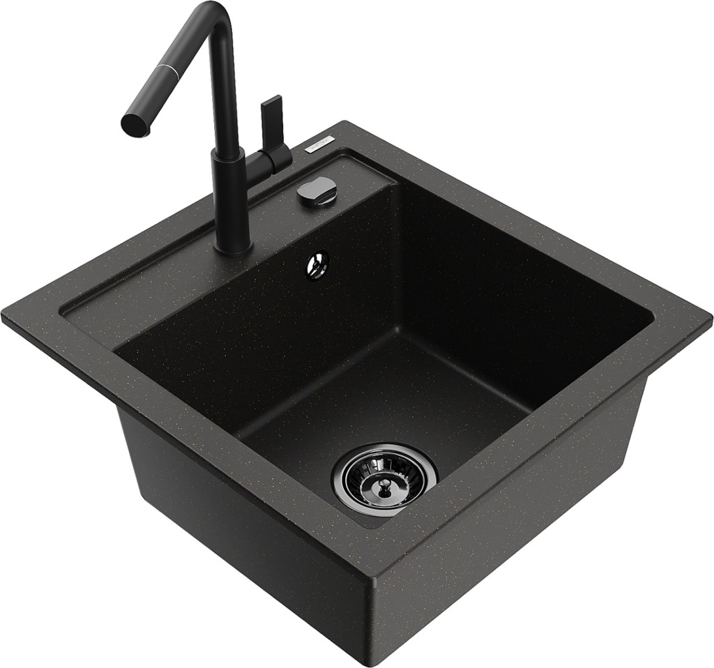 Technické dáta: drez: Rozmer: 520 x 490 x 210 mm Hĺbka komory: 200 mm Rozmery komory: 410x360 mm Priemer odtoku: ø90 mm Typ: 1-komorový Typ: Zapustené do pracovnej dosky Farba: čierna / zlatá metalíza Povrchová úprava sifónu: čierna Materiál: žula (80% žulové kamenivo, 20% živice) Prepadový otvor: Áno Otvory: (batérie, automatické) 2 Vysoká odolnosť proti poškriabaniu a zmene farby Odolnosť proti tepelným šokom Ľahko čistiteľný povrch Jeden dodatočný vyfrézovaný otvor na samodierovanie ø35 kuchynská batéria: Materiál: mosadz Čierna farba Hlava: Keramická Prevzdušňovač: Áno Typ: Jedna páka Rozsah výtoku: 245 mm Výška batérie: 307 mm(GT) Ean: 5905315057280