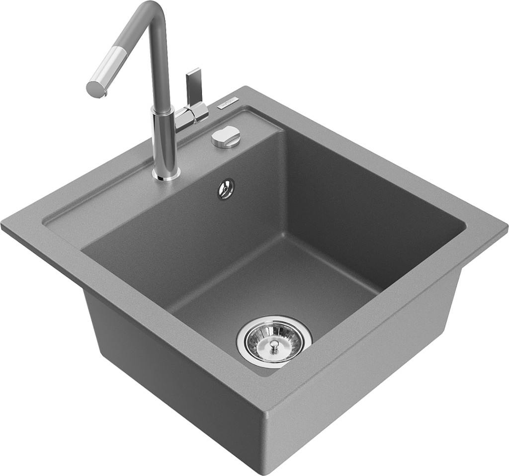 Technické dáta: drez: Rozmer: 520 x 490 x 210 mm Hĺbka komory: 200 mm Rozmery komory: 410x360 mm Priemer odtoku: ø90 mm Typ: 1-komorový Typ: Zapustené do pracovnej dosky Šedá farba Povrchová úprava sifónu: Chrome Materiál: žula (80% žulové kamenivo, 20% živice) Prepadový otvor: Áno Otvory: (batérie, automatické) 2 Vysoká odolnosť proti poškriabaniu a zmene farby Odolnosť proti tepelným šokom Ľahko čistiteľný povrch Jeden dodatočný vyfrézovaný otvor na samodierovanie ø35 kuchynská batéria: Materiál: mosadz Farba: chróm/sivá Hlava: Keramická Prevzdušňovač: Áno Typ: Jedna páka Rozsah výtoku: 245 mm Výška batérie: 307 mm(GT) Ean: 5905315057112