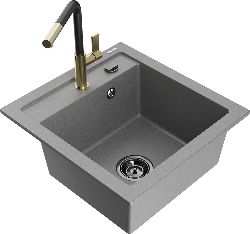 Technické dáta: drez: Rozmer: 520 x 490 x 210 mm Hĺbka komory: 200 mm Rozmery komory: 410x360 mm Priemer odtoku: ø90 mm Typ: 1-komorový Typ: Zapustené do pracovnej dosky Šedá farba Povrchová úprava sifónu: čierna Materiál: žula (80% žulové kamenivo, 20% živice) Prepadový otvor: Áno Otvory: (batérie, automatické) 2 Vysoká odolnosť proti poškriabaniu a zmene farby Odolnosť proti tepelným šokom Ľahko čistiteľný povrch Jeden dodatočný vyfrézovaný otvor na samodierovanie ø35 kuchynská batéria: Materiál: mosadz Farba: Zlatá/Čierna Hlava: Keramická Prevzdušňovač: Áno Typ: Jedna páka Rozsah výtoku: 245 mm Výška batérie: 307 mm(GT) Ean: 5905315057150
