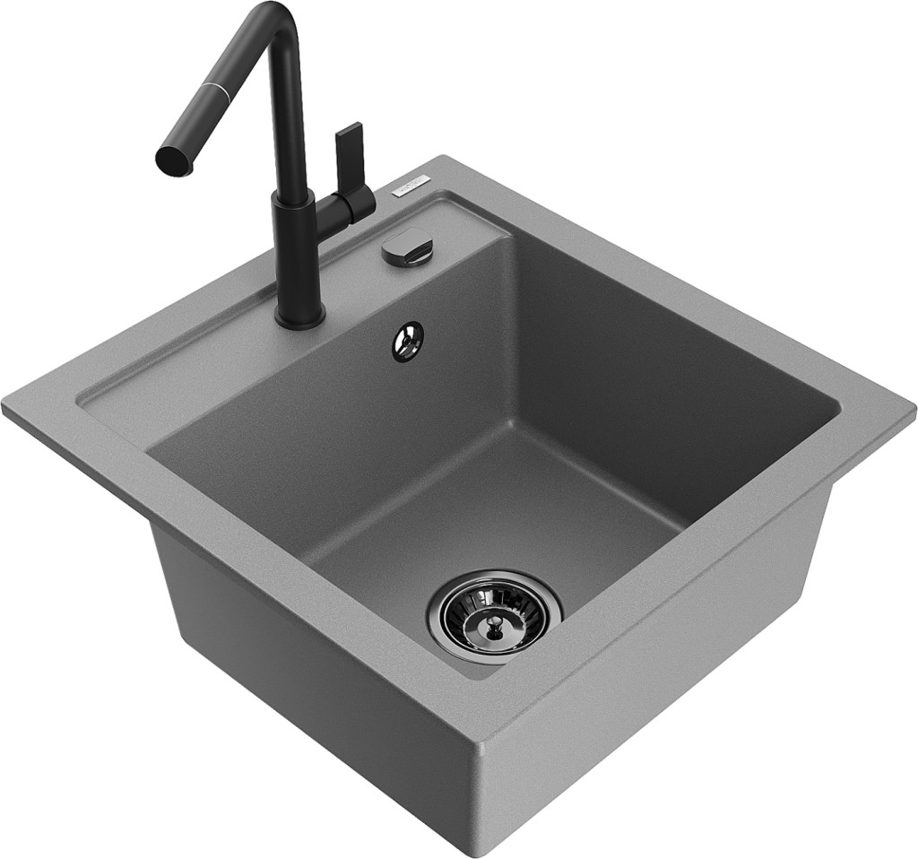 Technické dáta: drez: Rozmer: 520 x 490 x 210 mm Hĺbka komory: 200 mm Rozmery komory: 410x360 mm Priemer odtoku: ø90 mm Typ: 1-komorový Typ: Zapustené do pracovnej dosky Šedá farba Povrchová úprava sifónu: čierna Materiál: žula (80% žulové kamenivo, 20% živice) Prepadový otvor: Áno Otvory: (batérie, automatické) 2 Vysoká odolnosť proti poškriabaniu a zmene farby Odolnosť proti tepelným šokom Ľahko čistiteľný povrch Jeden dodatočný vyfrézovaný otvor na samodierovanie ø35 kuchynská batéria: Materiál: mosadz Čierna farba Hlava: Keramická Prevzdušňovač: Áno Typ: Jedna páka Rozsah výtoku: 245 mm Výška batérie: 307 mm(GT) Ean: 5905315057167