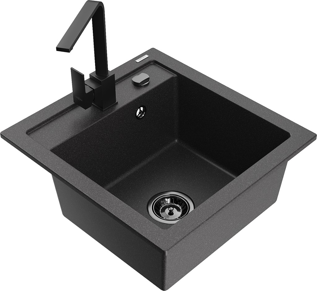 Technické dáta: drez: Rozmer: 520 x 490 x 210 mm Hĺbka komory: 200 mm Rozmery komory: 410x360 mm Priemer odtoku: ø90 mm Typ: 1-komorový Typ: Zapustené do pracovnej dosky Farba: Škvrnitá čierna Povrchová úprava sifónu: čierna Materiál: žula (80% žulové kamenivo, 20% živice) Prepadový otvor: Áno Otvory: (batérie, automatické) 2 Vysoká odolnosť proti poškriabaniu a zmene farby Odolnosť proti tepelným šokom Ľahko čistiteľný povrch Jeden dodatočný vyfrézovaný otvor na samodierovanie ø35 kuchynská batéria: Materiál: mosadz Čierna farba Hlava: Keramická Prevzdušňovač: Áno Typ: Jedna páka Výška batérie: 290 mm Rozsah výtoku: 220 mm(GT) Ean: 5905315017789
