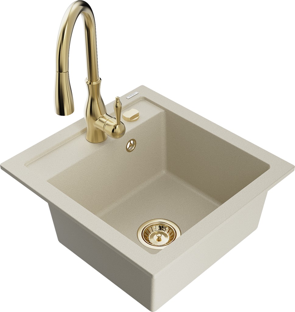 drez: Rozmer: 520 x 490 x 210 mm Hĺbka komory: 200 mm Rozmery komory: 410x360 mm Priemer odtoku: ø90 mm Typ: 1-komorový Typ: Zapustené do pracovnej dosky Farba béžová Povrchová úprava sifónu: zlatá Materiál: žula (80% žulové kamenivo, 20% živice) Prepadový otvor: Áno Otvory: (batérie, automatické) 2 Vysoká odolnosť proti poškriabaniu a zmene farby Odolnosť proti tepelným šokom Ľahko čistiteľný povrch Jeden dodatočný vyfrézovaný otvor na samodierovanie ø35 kuchynská batéria: Materiál: mosadz Farba: Zlatá Hlava: Keramická Prevzdušňovač: Áno Typ: Jedna páka Výška batérie: 410 mm Rozsah výtoku: 231 mm(GT) Ean: 5905315032966