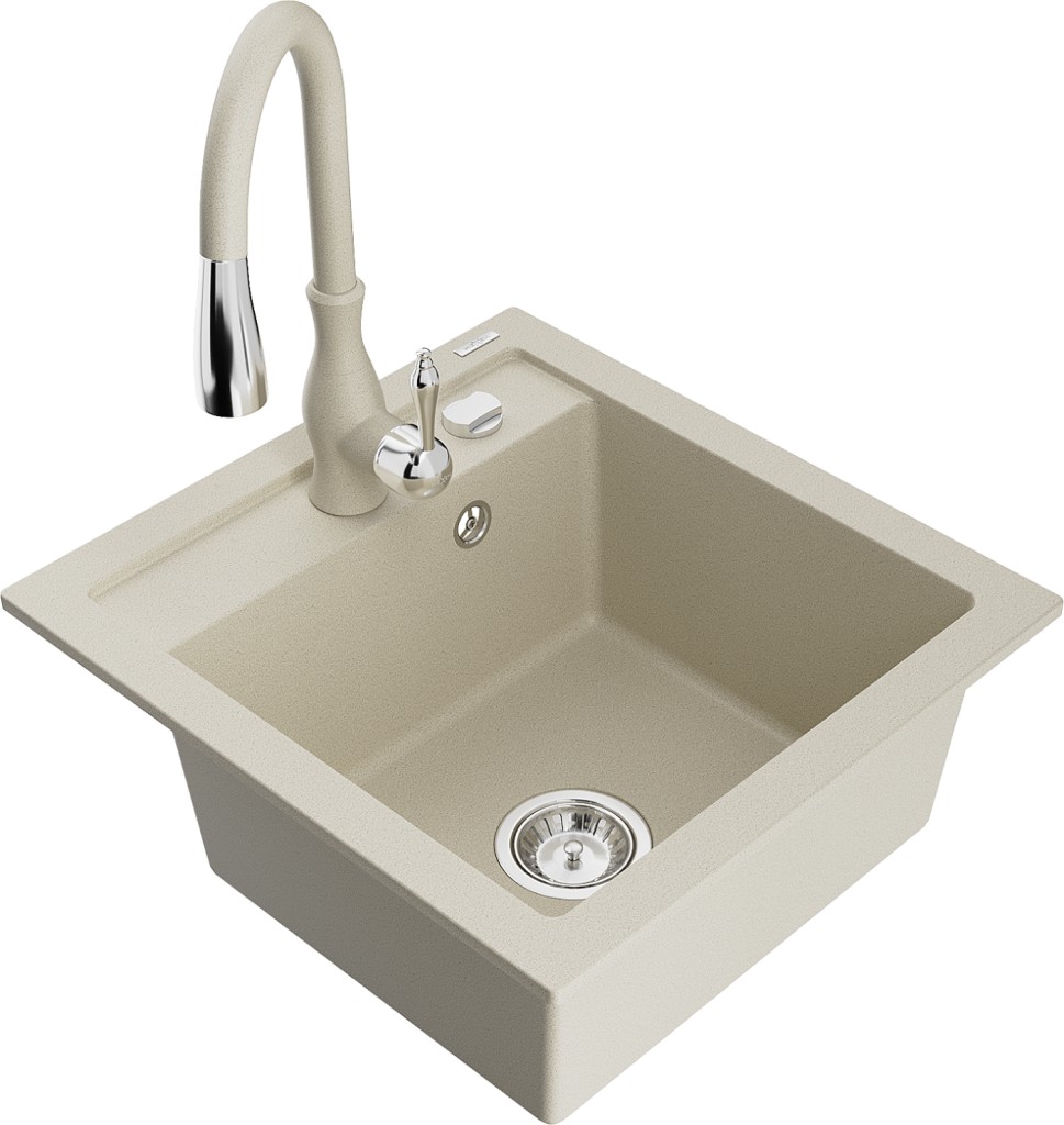 drez: Rozmer: 520 x 490 x 210 mm Hĺbka komory: 200 mm Rozmery komory: 410x360 mm Priemer odtoku: ø90 mm Typ: 1-komorový Typ: Zapustené do pracovnej dosky Farba béžová Povrchová úprava sifónu: Chrome Materiál: žula (80% žulové kamenivo, 20% živice) Prepadový otvor: Áno Otvory: (batérie, automatické) 2 Vysoká odolnosť proti poškriabaniu a zmene farby Odolnosť proti tepelným šokom Ľahko čistiteľný povrch Jeden dodatočný vyfrézovaný otvor na samodierovanie ø35 kuchynská batéria: Materiál: mosadz Farba béžová Hlava: Keramická Prevzdušňovač: Áno Typ: Jedna páka Výška batérie: 410 mm Rozsah výtoku: 231 mm(GT) Ean: 5905315032959