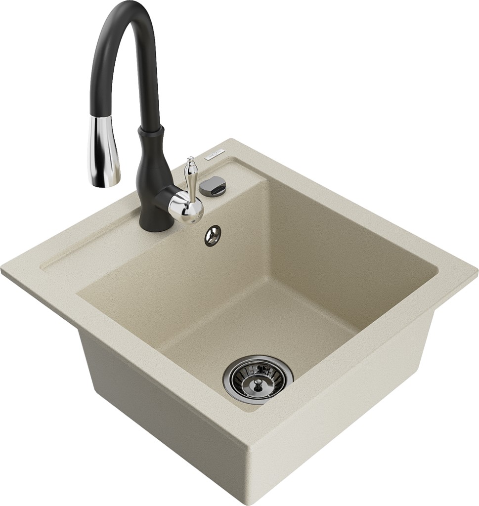 drez: Rozmer: 520 x 490 x 210 mm Hĺbka komory: 200 mm Rozmery komory: 410x360 mm Priemer odtoku: ø90 mm Typ: 1-komorový Typ: Zapustené do pracovnej dosky Farba béžová Povrchová úprava sifónu: čierna Materiál: žula (80% žulové kamenivo, 20% živice) Prepadový otvor: Áno Otvory: (batérie, automatické) 2 Vysoká odolnosť proti poškriabaniu a zmene farby Odolnosť proti tepelným šokom Ľahko čistiteľný povrch Jeden dodatočný vyfrézovaný otvor na samodierovanie ø35 kuchynská batéria: Materiál: mosadz Čierna farba Hlava: Keramická Prevzdušňovač: Áno Typ: Jedna páka Výška batérie: 410 mm Rozsah výtoku: 231 mm(GT) Ean: 5905315032973
