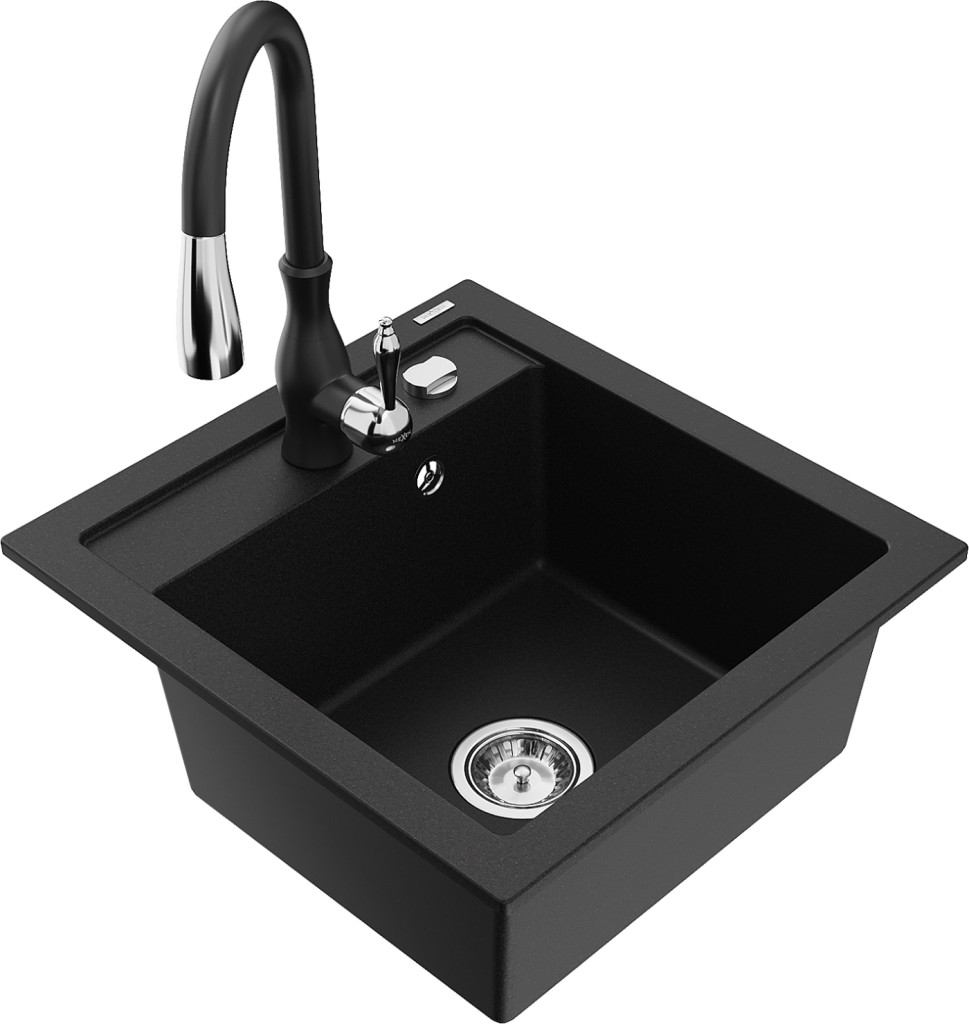 drez: Rozmer: 520 x 490 x 210 mm Hĺbka komory: 200 mm Rozmery komory: 410x360 mm Priemer odtoku: ø90 mm Typ: 1-komorový Typ: Zapustené do pracovnej dosky Čierna farba Povrchová úprava sifónu: Chrome Materiál: žula (80% žulové kamenivo, 20% živice) Prepadový otvor: Áno Otvory: (batérie, automatické) 2 Vysoká odolnosť proti poškriabaniu a zmene farby Odolnosť proti tepelným šokom Ľahko čistiteľný povrch Jeden dodatočný vyfrézovaný otvor na samodierovanie ø35 kuchynská batéria: Materiál: mosadz Čierna farba Hlava: Keramická Prevzdušňovač: Áno Typ: Jedna páka Výška batérie: 410 mm Rozsah výtoku: 231 mm(GT) Ean: 5905315033208