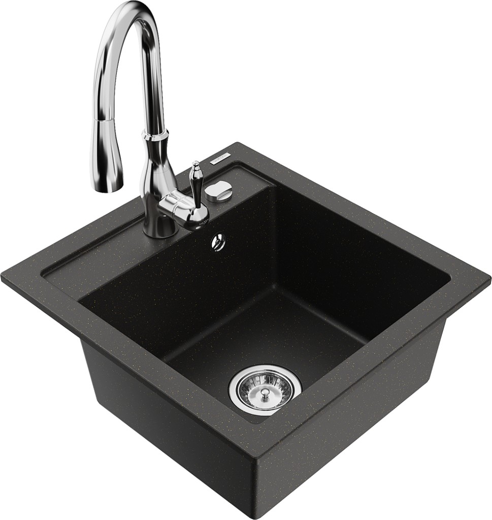 drez: Rozmer: 520 x 490 x 210 mm Hĺbka komory: 200 mm Rozmery komory: 410x360 mm Priemer odtoku: ø90 mm Typ: 1-komorový Typ: Zapustené do pracovnej dosky Farba: čierna / zlatá metalíza Povrchová úprava sifónu: Chrome Materiál: žula (80% žulové kamenivo, 20% živice) Prepadový otvor: Áno Otvory: (batérie, automatické) 2 Vysoká odolnosť proti poškriabaniu a zmene farby Odolnosť proti tepelným šokom Ľahko čistiteľný povrch Jeden dodatočný vyfrézovaný otvor na samodierovanie ø35 kuchynská batéria: Materiál: mosadz Farba: Chrome Hlava: Keramická Prevzdušňovač: Áno Typ: Jedna páka Výška batérie: 410 mm Rozsah výtoku: 231 mm(GT) Ean: 5905315033086