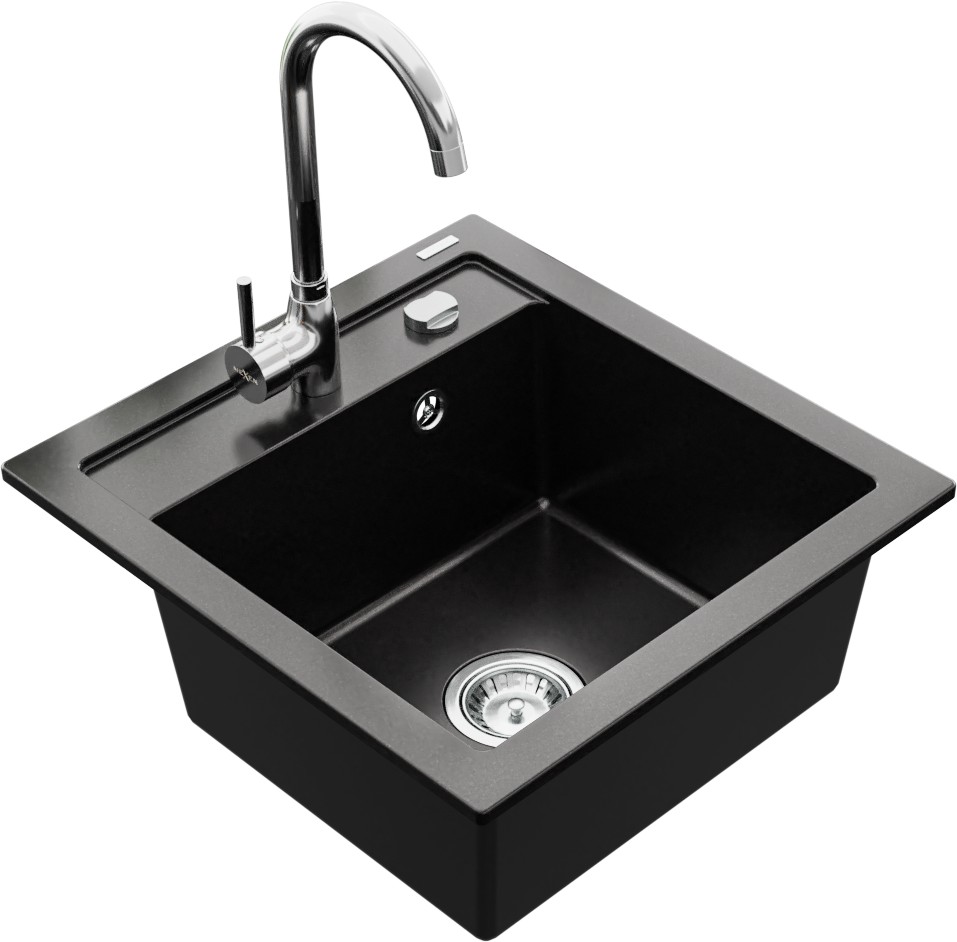 Technické dáta: drez: Rozmer: 520 x 490 x 210 mm Hĺbka komory: 200 mm Rozmery komory: 410x360 mm Priemer odtoku: ø90 mm Typ: 1-komorový Typ: Zapustené do pracovnej dosky Čierna farba Povrchová úprava sifónu: Chrome Materiál: žula (80% žulové kamenivo, 20% živice) Prepadový otvor: Áno Otvory: (batérie, automatické) 2 Vysoká odolnosť proti poškriabaniu a zmene farby Odolnosť proti tepelným šokom Ľahko čistiteľný povrch Jeden dodatočný vyfrézovaný otvor na samodierovanie ø35 kuchynská batéria: Materiál: mosadz Farba: Chrome Hlava: Keramická Prevzdušňovač: Áno Výška batérie: 335 mm Rozsah výtoku: 180 mm(GT) Ean: 5907709189379