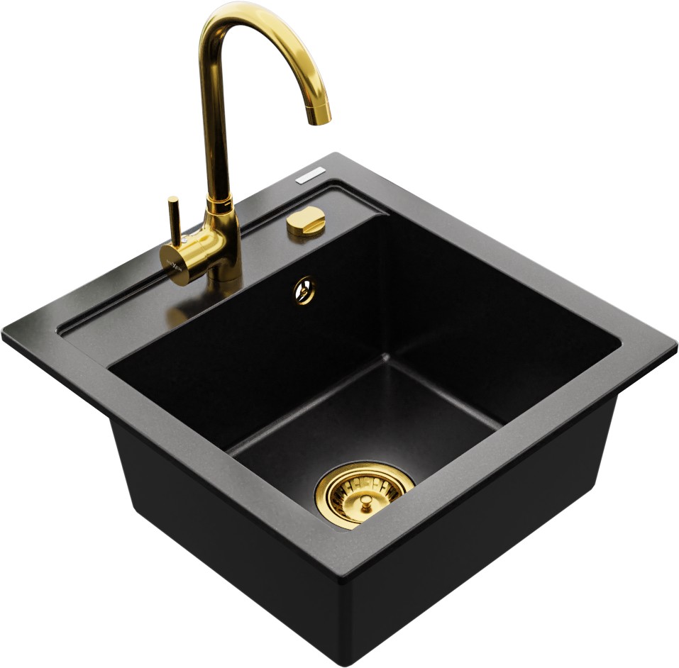 Technické dáta: drez: Rozmer: 520 x 490 x 210 mm Hĺbka komory: 200 mm Rozmery komory: 410x360 mm Priemer odtoku: ø90 mm Typ: 1-komorový Typ: Zapustené do pracovnej dosky Čierna farba Povrchová úprava sifónu: zlatá Materiál: žula (80% žulové kamenivo, 20% živice) Prepadový otvor: Áno Otvory: (batérie, automatické) 2 Vysoká odolnosť proti poškriabaniu a zmene farby Odolnosť proti tepelným šokom Ľahko čistiteľný povrch Jeden dodatočný vyfrézovaný otvor na samodierovanie ø35 kuchynská batéria: Materiál: mosadz Farba: Zlatá Hlava: Keramická Prevzdušňovač: Áno Výška batérie: 335 mm Rozsah výtoku: 180 mm(GT) Ean: 5907709189386