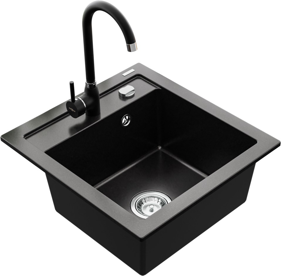 Technické dáta: drez: Rozmer: 520 x 490 x 210 mm Hĺbka komory: 200 mm Rozmery komory: 410x360 mm Priemer odtoku: ø90 mm Typ: 1-komorový Typ: Zapustené do pracovnej dosky Čierna farba Povrchová úprava sifónu: Chrome Materiál: žula (80% žulové kamenivo, 20% živice) Prepadový otvor: Áno Otvory: (batérie, automatické) 2 Vysoká odolnosť proti poškriabaniu a zmene farby Odolnosť proti tepelným šokom Ľahko čistiteľný povrch Jeden dodatočný vyfrézovaný otvor na samodierovanie ø35 kuchynská batéria: Materiál: mosadz Čierna farba Hlava: Keramická Prevzdušňovač: Áno Výška batérie: 335 mm Rozsah výtoku: 180 mm(GT) Ean: 5907709189393