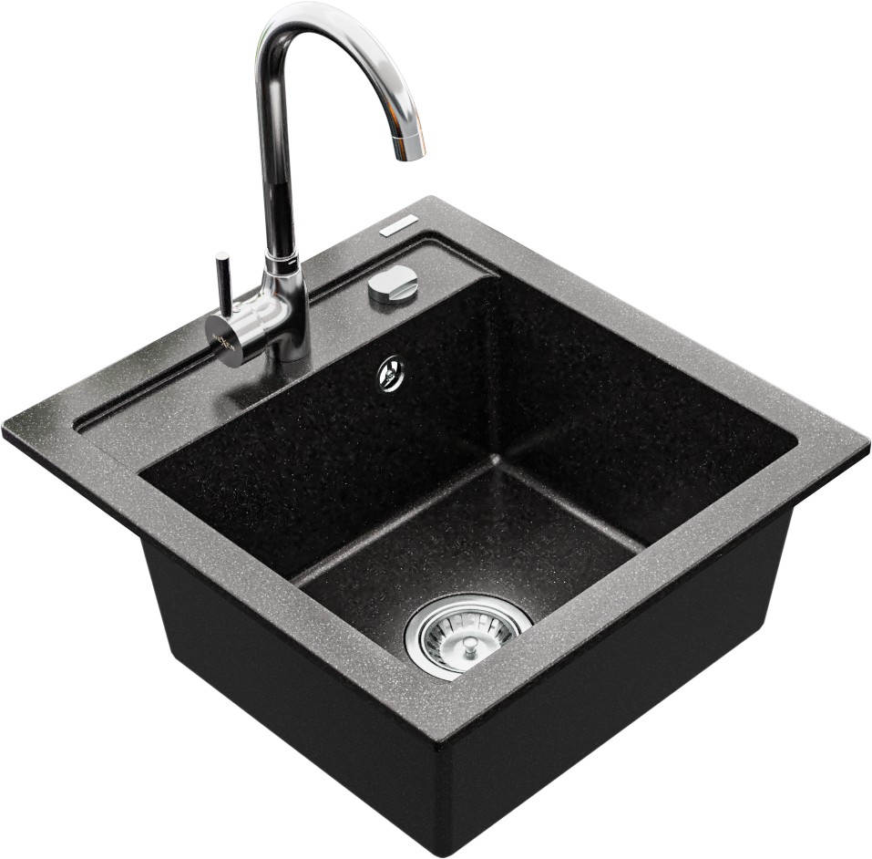 Technické dáta: drez: Rozmer: 520 x 490 x 210 mm Hĺbka komory: 200 mm Rozmery komory: 410x360 mm Priemer odtoku: ø90 mm Typ: 1-komorový Typ: Zapustené do pracovnej dosky Farba: Škvrnitá čierna Povrchová úprava sifónu: Chrome Materiál: žula (80% žulové kamenivo, 20% živice) Prepadový otvor: Áno Otvory: (batérie, automatické) 2 Vysoká odolnosť proti poškriabaniu a zmene farby Odolnosť proti tepelným šokom Ľahko čistiteľný povrch Jeden dodatočný vyfrézovaný otvor na samodierovanie ø35 kuchynská batéria: Materiál: mosadz Farba: Chrome Hlava: Keramická Prevzdušňovač: Áno Výška batérie: 335 mm Rozsah výtoku: 180 mm(GT) Ean: 5907709189355