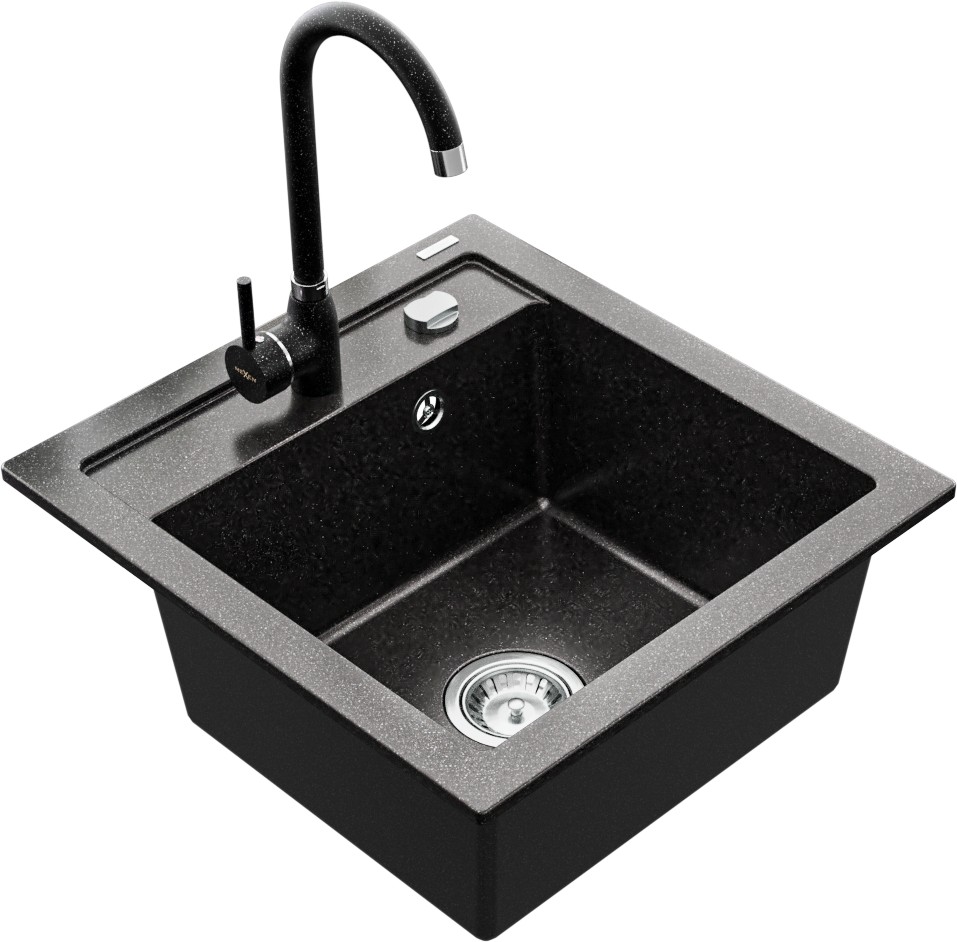 Technické dáta: drez: Rozmer: 520 x 490 x 210 mm Hĺbka komory: 200 mm Rozmery komory: 410x360 mm Priemer odtoku: ø90 mm Typ: 1-komorový Typ: Zapustené do pracovnej dosky Farba: Škvrnitá čierna Povrchová úprava sifónu: Chrome Materiál: žula (80% žulové kamenivo, 20% živice) Prepadový otvor: Áno Otvory: (batérie, automatické) 2 Vysoká odolnosť proti poškriabaniu a zmene farby Odolnosť proti tepelným šokom Ľahko čistiteľný povrch Jeden dodatočný vyfrézovaný otvor na samodierovanie ø35 kuchynská batéria: Materiál: mosadz Farba: Škvrnitá čierna Hlava: Keramická Prevzdušňovač: Áno Výška batérie: 335 mm Rozsah výtoku: 180 mm(GT) Ean: 5907709189362