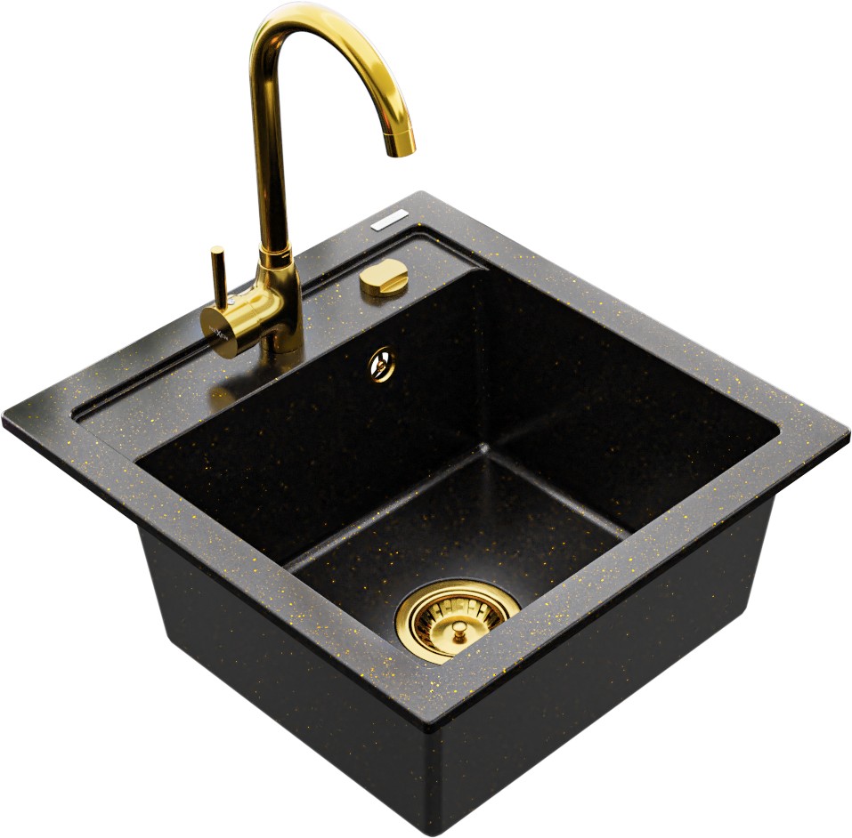 Technické dáta: drez: Rozmer: 520 x 490 x 210 mm Hĺbka komory: 200 mm Rozmery komory: 410x360 mm Priemer odtoku: ø90 mm Typ: 1-komorový Typ: Zapustené do pracovnej dosky Farba: čierna / zlatá metalíza Povrchová úprava sifónu: zlatá Materiál: žula (80% žulové kamenivo, 20% živice) Prepadový otvor: Áno Otvory: (batérie, automatické) 2 Vysoká odolnosť proti poškriabaniu a zmene farby Odolnosť proti tepelným šokom Ľahko čistiteľný povrch Jeden dodatočný vyfrézovaný otvor na samodierovanie ø35 kuchynská batéria: Materiál: mosadz Farba: Zlatá Hlava: Keramická Prevzdušňovač: Áno Výška batérie: 335 mm Rozsah výtoku: 180 mm(GT) Ean: 5907709189331