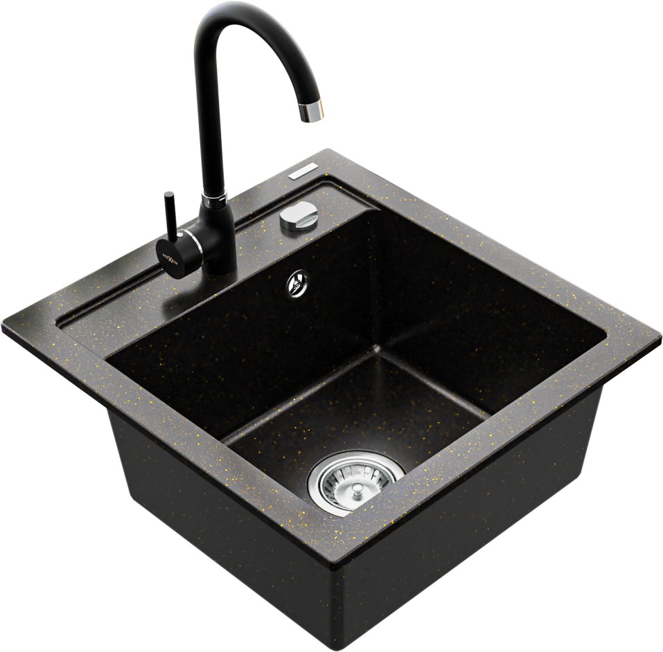 Technické dáta: drez: Rozmer: 520 x 490 x 210 mm Hĺbka komory: 200 mm Rozmery komory: 410x360 mm Priemer odtoku: ø90 mm Typ: 1-komorový Typ: Zapustené do pracovnej dosky Farba: čierna / zlatá metalíza Povrchová úprava sifónu: Chrome Materiál: žula (80% žulové kamenivo, 20% živice) Prepadový otvor: Áno Otvory: (batérie, automatické) 2 Vysoká odolnosť proti poškriabaniu a zmene farby Odolnosť proti tepelným šokom Ľahko čistiteľný povrch Jeden dodatočný vyfrézovaný otvor na samodierovanie ø35 kuchynská batéria: Materiál: mosadz Čierna farba Hlava: Keramická Prevzdušňovač: Áno Výška batérie: 335 mm Rozsah výtoku: 180 mm(GT) Ean: 5907709189348