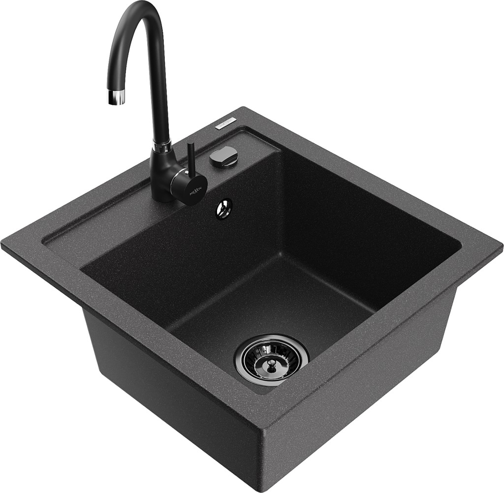Technické dáta: drez: Rozmer: 520 x 490 x 210 mm Hĺbka komory: 200 mm Rozmery komory: 410x360 mm Priemer odtoku: ø90 mm Typ: 1-komorový Typ: Zapustené do pracovnej dosky Farba: Škvrnitá čierna Povrchová úprava sifónu: čierna Materiál: žula (80% žulové kamenivo, 20% živice) Prepadový otvor: Áno Otvory: (batérie, automatické) 2 Vysoká odolnosť proti poškriabaniu a zmene farby Odolnosť proti tepelným šokom Ľahko čistiteľný povrch Jeden dodatočný vyfrézovaný otvor na samodierovanie ø35 kuchynská batéria: Materiál: mosadz Čierna farba Hlava: Keramická Prevzdušňovač: Áno Typ: Jedna páka Výška batérie: 335 mm Rozsah výtoku: 180 mm(GT) Ean: 5905315014207