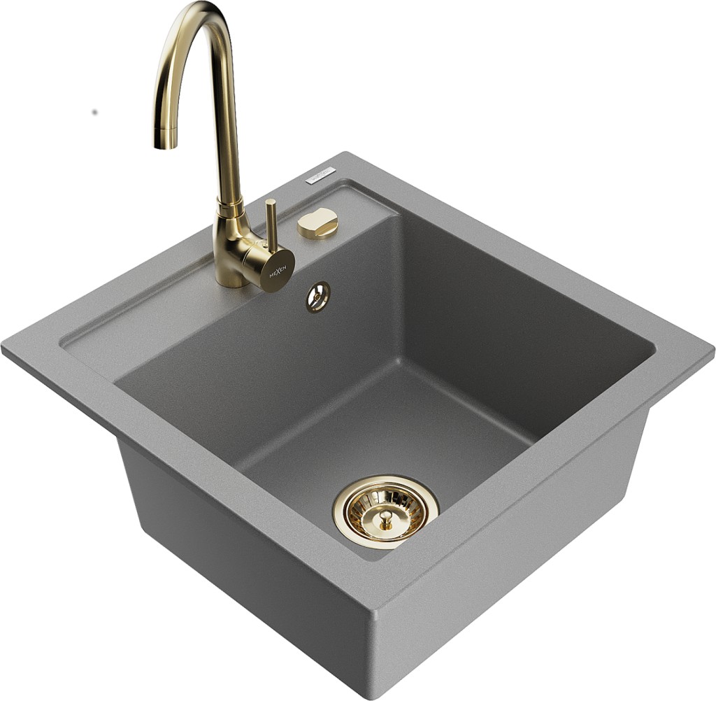 Technické dáta: drez: Rozmer: 520 x 490 x 210 mm Hĺbka komory: 200 mm Rozmery komory: 410x360 mm Priemer odtoku: ø90 mm Typ: 1-komorový Typ: Zapustené do pracovnej dosky Šedá farba Povrchová úprava sifónu: zlatá Materiál: žula (80% žulové kamenivo, 20% živice) Prepadový otvor: Áno Otvory: (batérie, automatické) 2 Vysoká odolnosť proti poškriabaniu a zmene farby Odolnosť proti tepelným šokom Ľahko čistiteľný povrch Jeden dodatočný vyfrézovaný otvor na samodierovanie ø35 kuchynská batéria: Materiál: mosadz Farba: Zlatá Hlava: Keramická Prevzdušňovač: Áno Typ: Jedna páka Výška batérie: 335 mm Rozsah výtoku: 180 mm(GT) Ean: 5905315014108