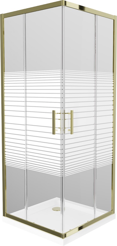 Technické údaje kabíny: Rozmer: 80 x 80 cm Výška: 190 cm Montáž: Univerzálna Vstup: Posuvné dvere Farba skla: pruhy Povrchová úprava: zlatá Typ skla: Tvrdené Hrúbka skla: 5 mm Profil: Hliník Ľahko čistiteľný povlak: Áno Vyrovnanie nerovností steny: Áno Nastavenie šírky: Áno Možno inštalovať na sprchovú vaničku alebo dlaždice: Áno Kovová rukoväť Súprava tesnení na odvod vody Hliníkový prah tesniace dvere Technické dáta sprchovej vaničky: Rozmer: 80 x 80 x 5 cm biela farba Typ: štvorcový, tenký Materiál: sanitárny akryl Vystužené dno Kompletný so sifónom vyčisteným zhora Priemer odtoku: 90 mm Povrchová úprava korku: zlatá (GT) Ean: 5907709148000