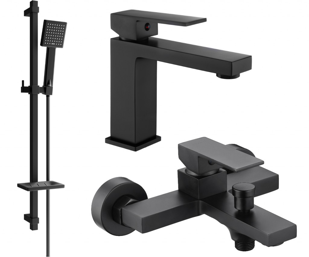 Technické dáta: Materiál umývadlovej batérie: mosadz Povrchová úprava: čierna Hlava: Keramická Perlátor: Áno Výška: 146 mm Rozsah výtoku: 122 mm Materiál vaňovej batérie: Mosadz Povrchová úprava: čierna Hlava: Keramická Perlátor: Áno Dosah výtoku: 168,3 mm Materiál hriadeľa: Nerezová oceľ, ABS Povrchová úprava palice: čierna Výška: 800 mm Šírka lišty: 22 mm Vzdialenosť od steny: 160 mm Miska na mydlo Posuvný držiak na slúchadlo Nastaviteľné montážne držiaky Materiál slúchadiel: Plast Povrchová úprava slúchadiel: čierna Počet funkcií: 1 Výška slúchadla: 225 mm Šírka hlavy: 85 mm Materiál hadice: PVC Hadie prevedenie: Čierna Dĺžka hadice: 150 cm Mosadzné hroty Hladký povrch uľahčuje údržbu Otočné hroty zabraňujú krúteniu Pružný materiál odolný proti roztiahnutiu a ohybu (GT) Ean: 5907709186347