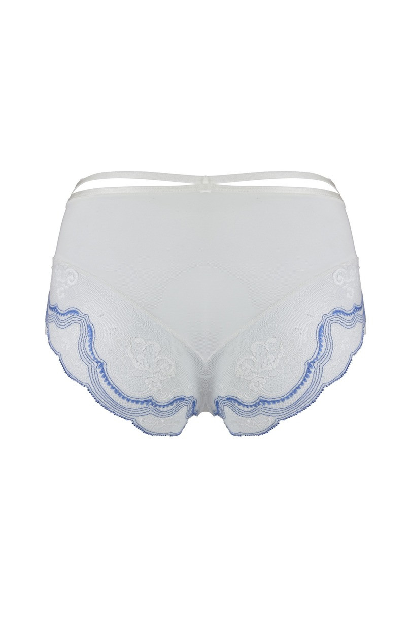 Mäkká podprsenka typu balconette s košíčkami z jemnej sieťoviny zdobenými jemnou čipkou s modrou niťou. Výstrih zdobia nastaviteľné ramienka, dizajn, ktorý nadvihuje a zhromažďuje poprsie smerom dovnútra. Konštrukcia MS5 DELICE Zloženie: 85 % polyamid, 10 % elastan, 5 % polyester.