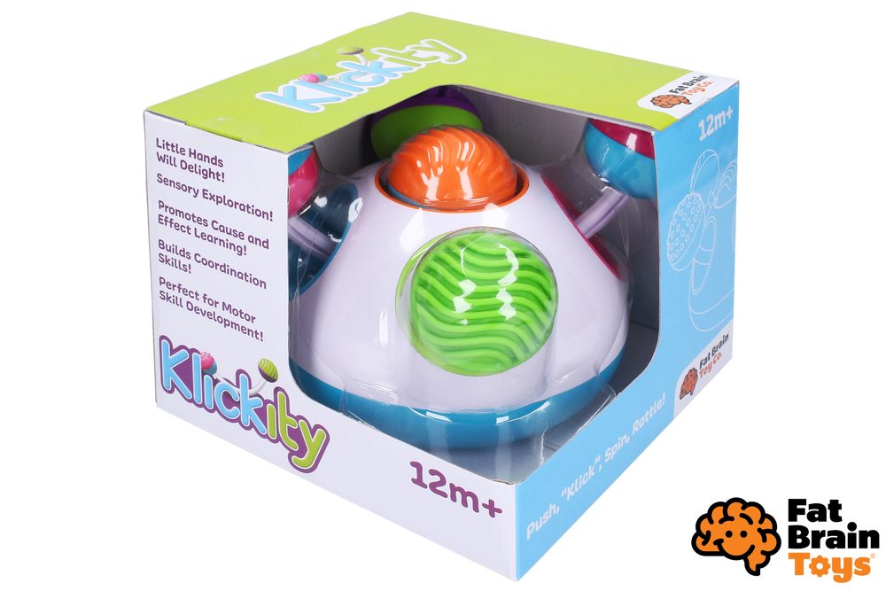 Klickitat, motorická hračka. Jednotlivé gule možno zatlačiť do stredu. Po zatlačení cvaknú. Po opätovnom zatlačení vyskočí von. Mäkký povrch a textúra. Malé detské ručičky hneď zaujme táto jedinečná hračka. Zatlač ružovú guličku a modrá na druhej strane bude vytlačená von. Zelenú a fialovú guľôčku môžete stláčať ako tlačidla, zatiaľ čo oranžovo - zelená gulička sa otáča okolo svojej osi. gumovitý a textúrovaný povrch ale aj krásne farby rozvíjajú detské zmysly. Hračka Klickitat je zo spodnej strany…