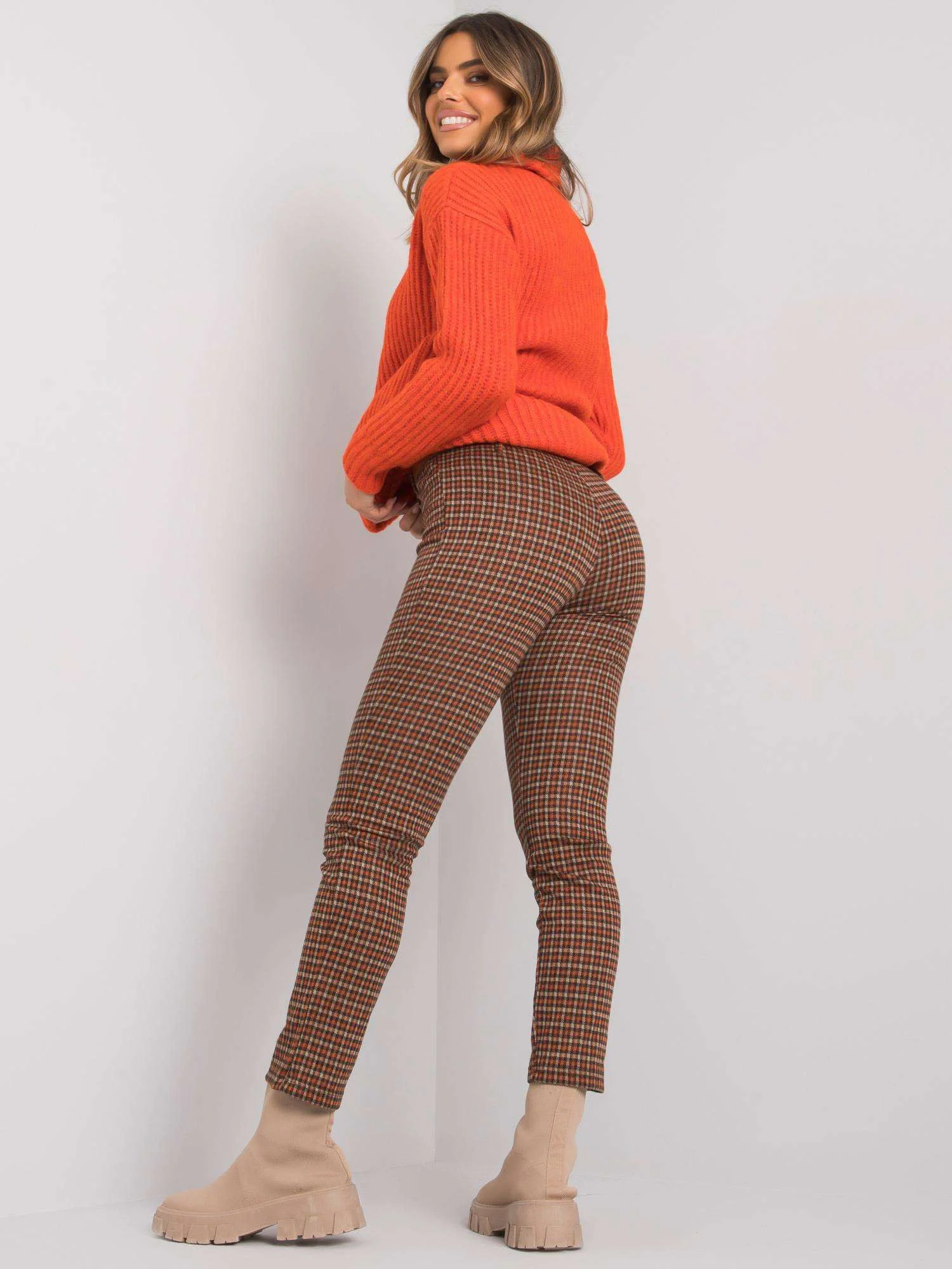 Oranžové a béžové kockované nohavice . príslušenstvo: opasok Zloženie materiálu: 95% polyester, 5% elastan spôsob prania: pranie v práčke na 30 °C Modelka má na sebe veľkosť 36. Rozmery modelky: výška 173 cm, prsia 97 cm, pás 67 cm, boky 95 cm. Rozmery nohavíc veľkosti 36 merané na plocho: šírka v páse - 35 cm, výška v páse - 26 cm, celková dĺžka - 96 cm Medzinárodná veľkosť Výška Obvod pása Obvod bokov Vonkajšia dĺžka nohavíc Dĺžka vnútornej nohavice 36 S 160-168 72-80 90 87 74 38 M 162-172 78-86 94 90 75 40 L 164-174 84-90 102 94 76