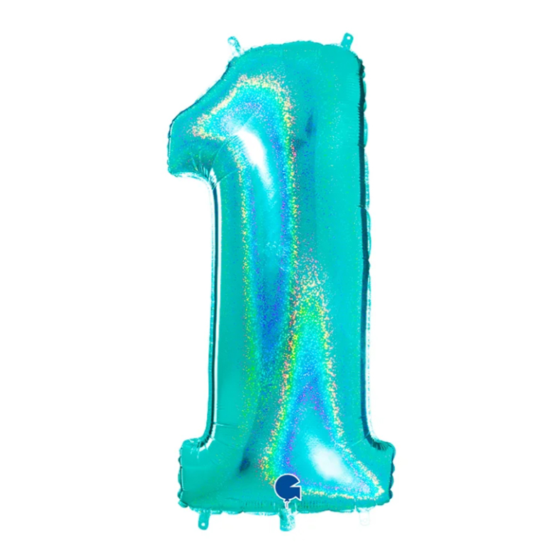 Nafúknuteľný balón číslo 1 tyrkys holografický 102 cm - Grabo - Grabo