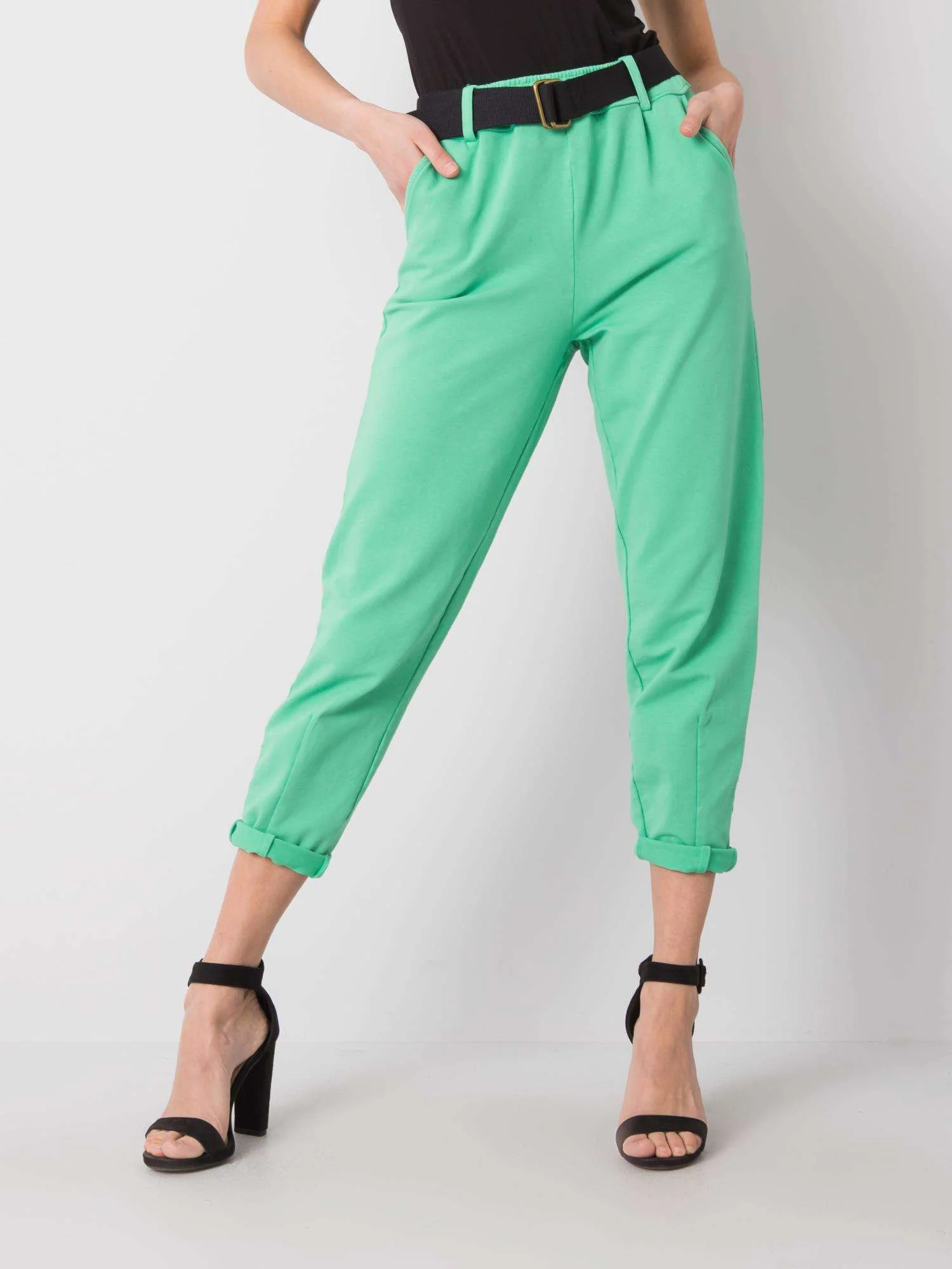 Dámske zelené nohavice s opaskom . príslušenstvo: opasok zloženie látky: 95% bavlna, 5% elastan spôsob prania: pranie v práčke na 30 °C Modelka má na sebe veľkosť S. Rozmery modelky: výška 174 cm, poprsie 86 cm, pás 60 cm, boky 86 cm. Nohavice veľkosti S merané na plocho: šírka v páse - 33 cm, výška v páse - 28 cm, celková dĺžka - 94 cm Medzinárodná veľkosť Výška Obvod pása Obvod bokov Vonkajšia dĺžka nohavíc Dĺžka vnútornej nohavice S 36 160-168 72-80 90 87 74 M 38 162-172 78-86 94 90 75 L 40 164-174 84-90 102 94 76 XL 42 166-178 88-96 106 98 77