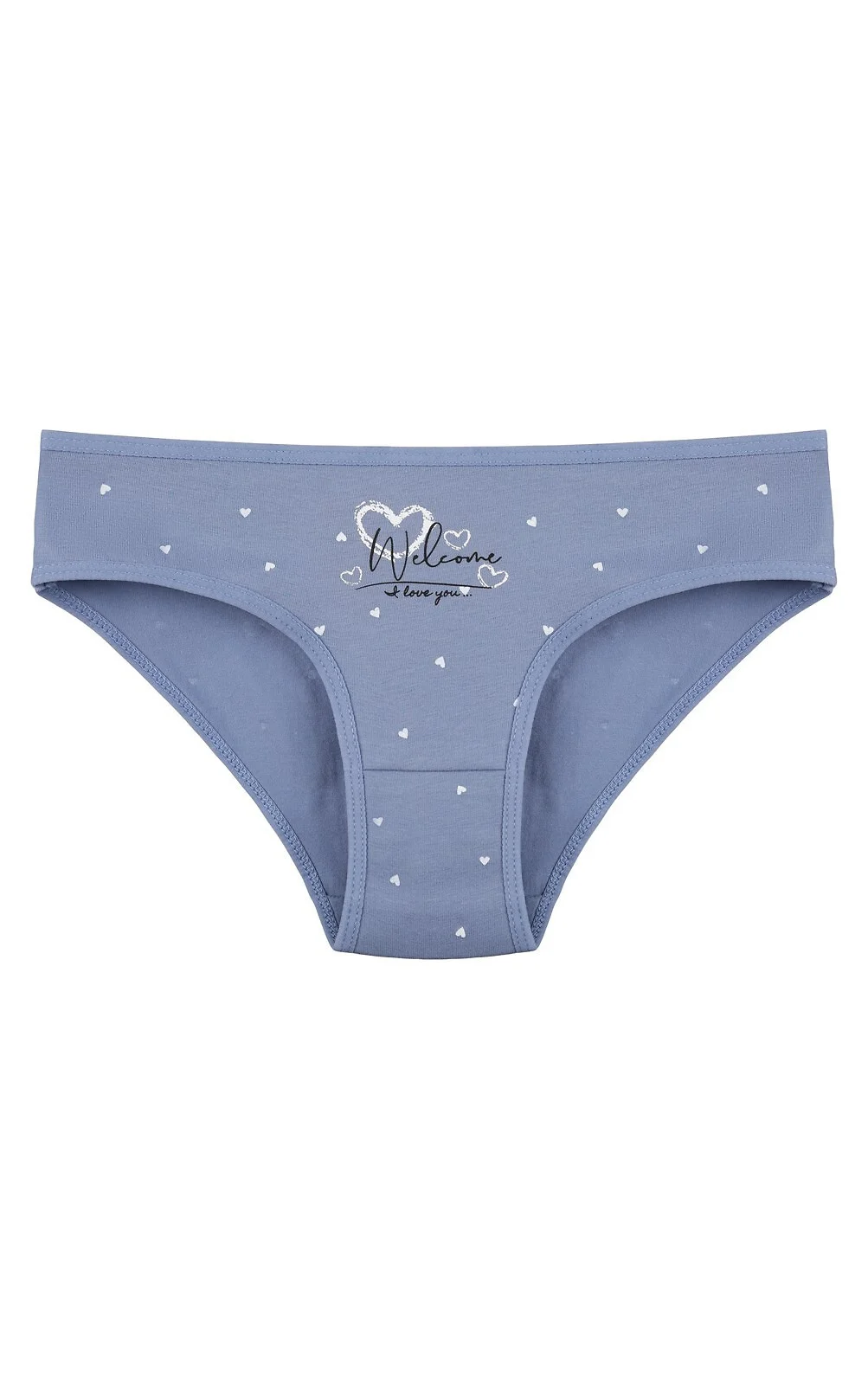 Bavlnené nohavičky pre dospievajúce dievčatá - ozdobná potlač na prednej strane - dostupné farby: ružová, fialová, púdrovo ružová, modrá, džínsová, tmavomodrá - balené v pároch v polyetylénovom vrecku v rôznych farebných kombináciách Zloženie: 95 % bavlna, 5 % elastan