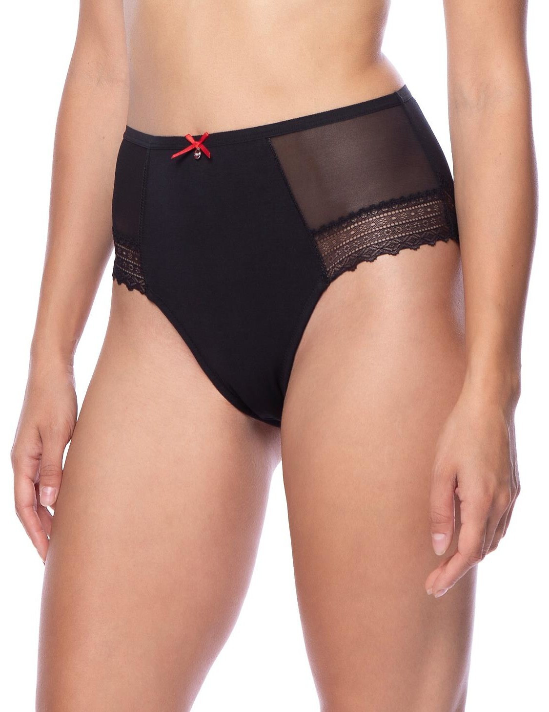 Dámske nohavičky midi strihu - vysoký pás, zvýraznené boky - tylové a čipkované vsadky na prednej strane - plochý elastický pás so saténovou mašľou a visačkou s logom LAMA - balené po dvoch kusoch - jeden čierny, druhý s kvetmi Zloženie: 95 % bavlna, 5 % elastan