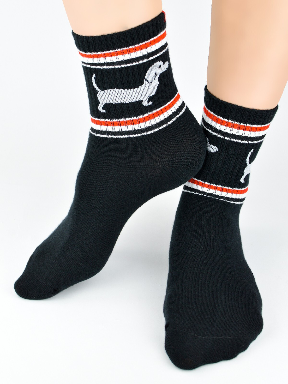 Dámske ponožky - rebrovaný zvršok - farebný psí vzor - ploché švy - netlačiaci sa lem Zloženie: 75 % bavlna, 19 % polyamid, 6 % elastan