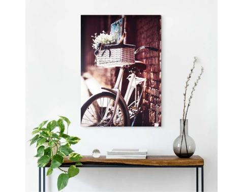 Obraz tlačený na plátne s motívom zaparkovaného bicykla s košíkom, ozdobí akýkoľvek interiér. Rozmer 50x70 cm.