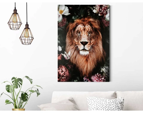 Krásny obraz tlačený na plátne s motívom leva v kvetoch sa stane skutočným pútačom a okamžite oživí každý interiér. Rozmer 60x80 cm.