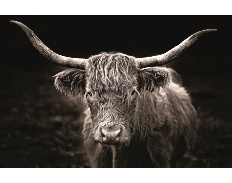 Obraz na plátne 118x78 cm s motívom škótskej kravy v monochromatickom prevedení sa stane neprehliadnutou dekoráciou každého interiéru.