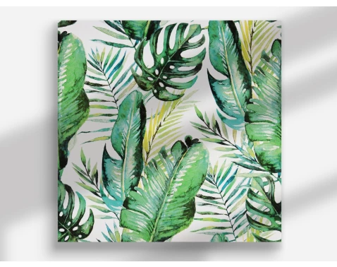 Obraz tlačený na plátne s motívom tropických listov príjemne oživí stenu v akejkoľvek miestnosti. Rozmer 40x40 cm.