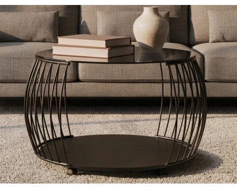 Okrúhly konferenčný stolík s priemerom 80 cm v modernom zaoblenom dizajne pôsobí v obývačke vzdušne. Čierny kov a dymovo šedé sklo dopĺňajú odkladacie police.