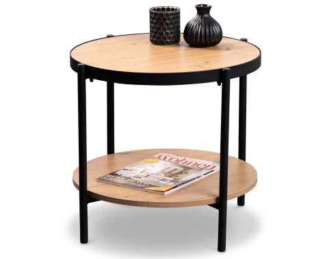 Okrúhly stolík s priemerom 60 cm je vyrobený v drevodekore dub artisan v kombinácii s čiernym kovovým rámom, ktorý tvorí modernú optiku a zaisťuje stabilitu.