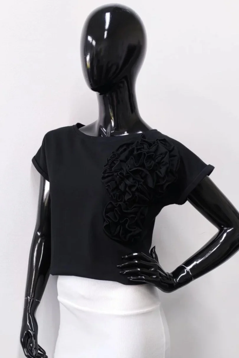 Dodajte svojmu šatníku nádych elegancie a ženského šarmu s touto jedinečnou dámskou blúzkou s krátkymi rukávmi. Vďaka klasickému strihu s moderným nádychom - vyhrnutým rukávom a predĺženému, mierne zaoblenému zadnému dielu - je ideálna na každodenný aj formálnejší vzhľad. 3D kvety sú skutočnou ozdobou, ktorá celému vzhľadu dodáva módny a originálny nádych. Je vyrobená z mäkkej, priedušnej bavlny s elastanom, čo zaručuje pohodlné nosenie a príjemné nosenie.