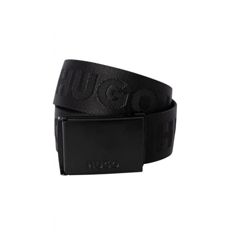Vlastnosti: Farba: čierna Logo HUGO Typ: pánsky opasok na voľný čas Materiálové zloženie: 60 % polyuretán, 40 % polyester Šírka opasku: približne 3,5 cm Spona: klasická, kovová s matným povrchom Štýl: ležérny, streetwear, smart-casual